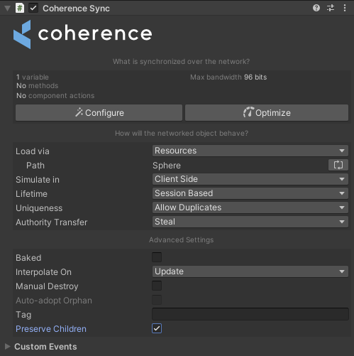 Objects with the `CoherenceSync` component can be connected to other objects with `CoherenceSync` components to form a parent-child relationship. For example, an object can be linked to a hand, a hand to an arm, and the arm to a spine.
