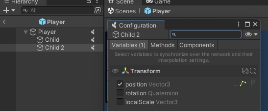 If a synced Prefab has a hierarchy, you can synchronize variables, methods and component actions for any of the child GameObjects within its hierarchy.