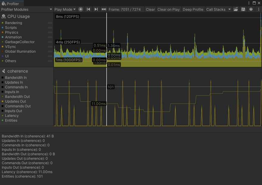 An integration with the Unity Profiler provides basic statistics on networking events and bandwidth.