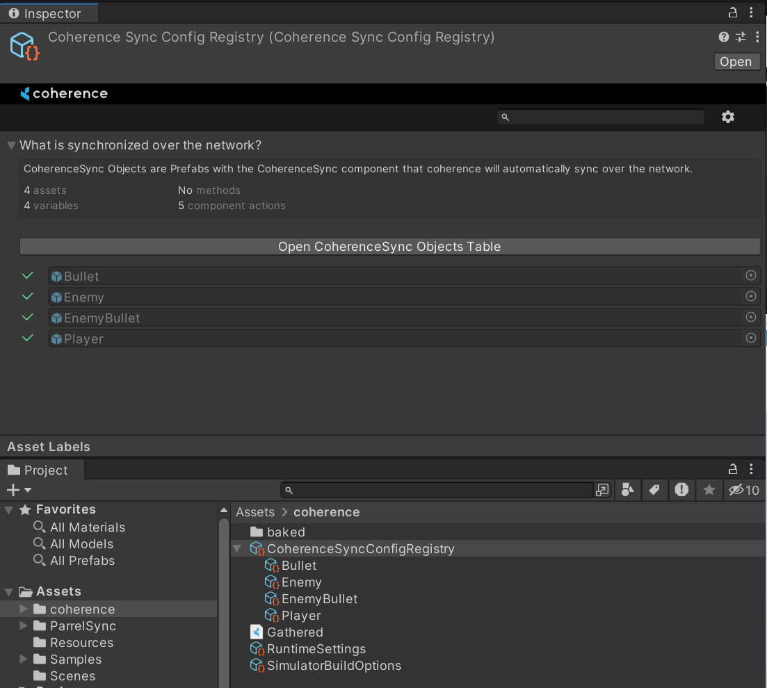 Whenever you start synchronizing one of your prefabs, either by adding the CoherenceSync component manually or clicking the Sync with coherence toggle in the prefab inspector, coherence will automatically create a CoherenceSyncConfig object that will be added to the CoherenceSyncConfigRegistry asset found in the Assets/coherence folder.