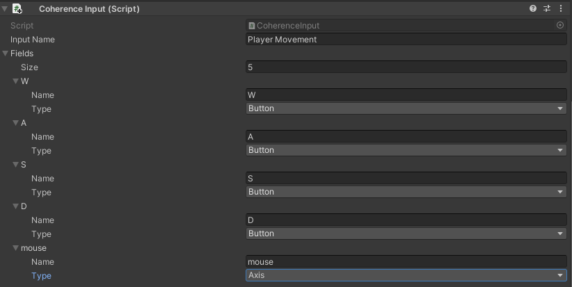 To declare the inputs used by the CoherenceSync component, the CoherenceInput component is added to the object. The input is named and the fields are defined.