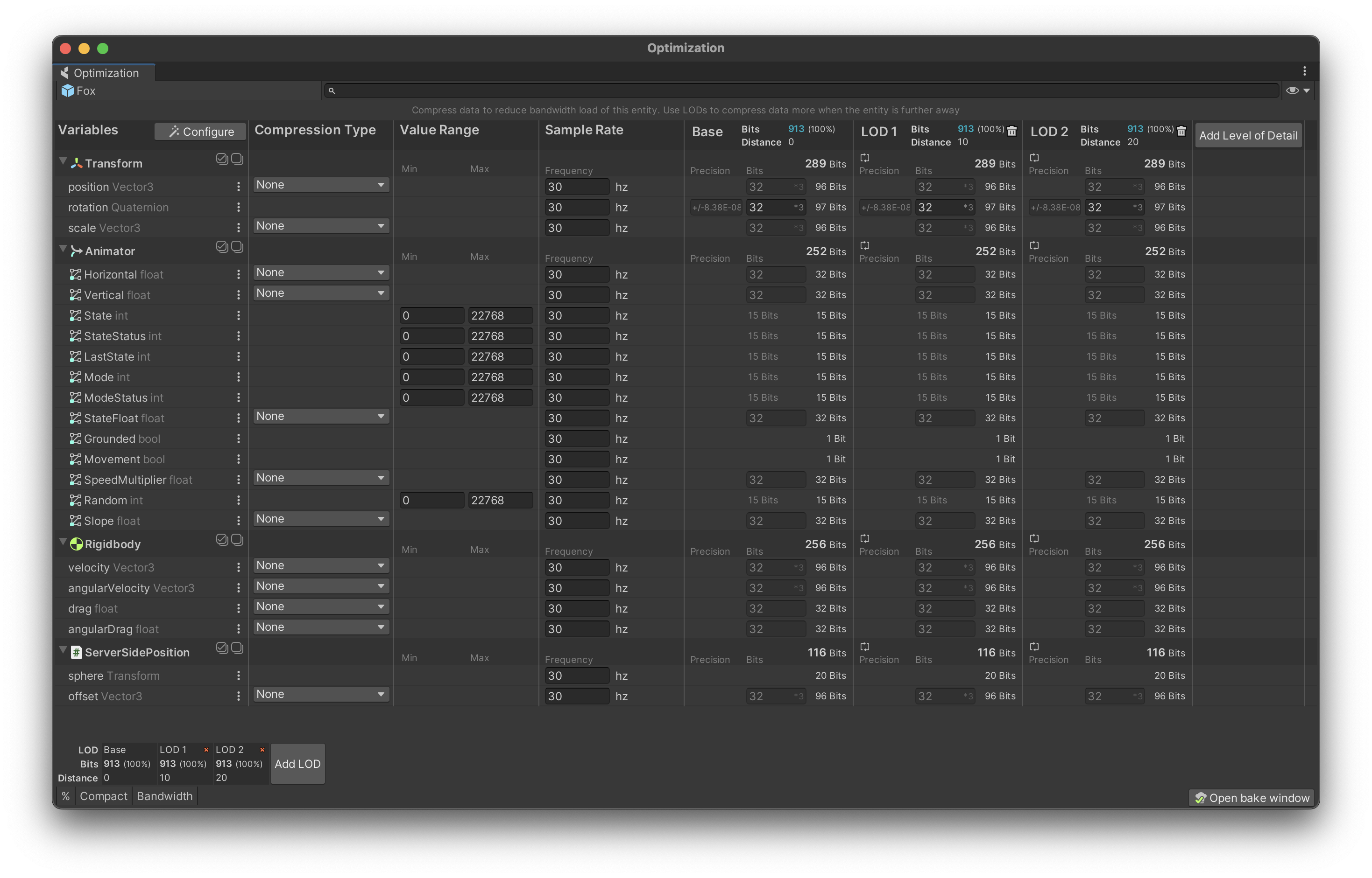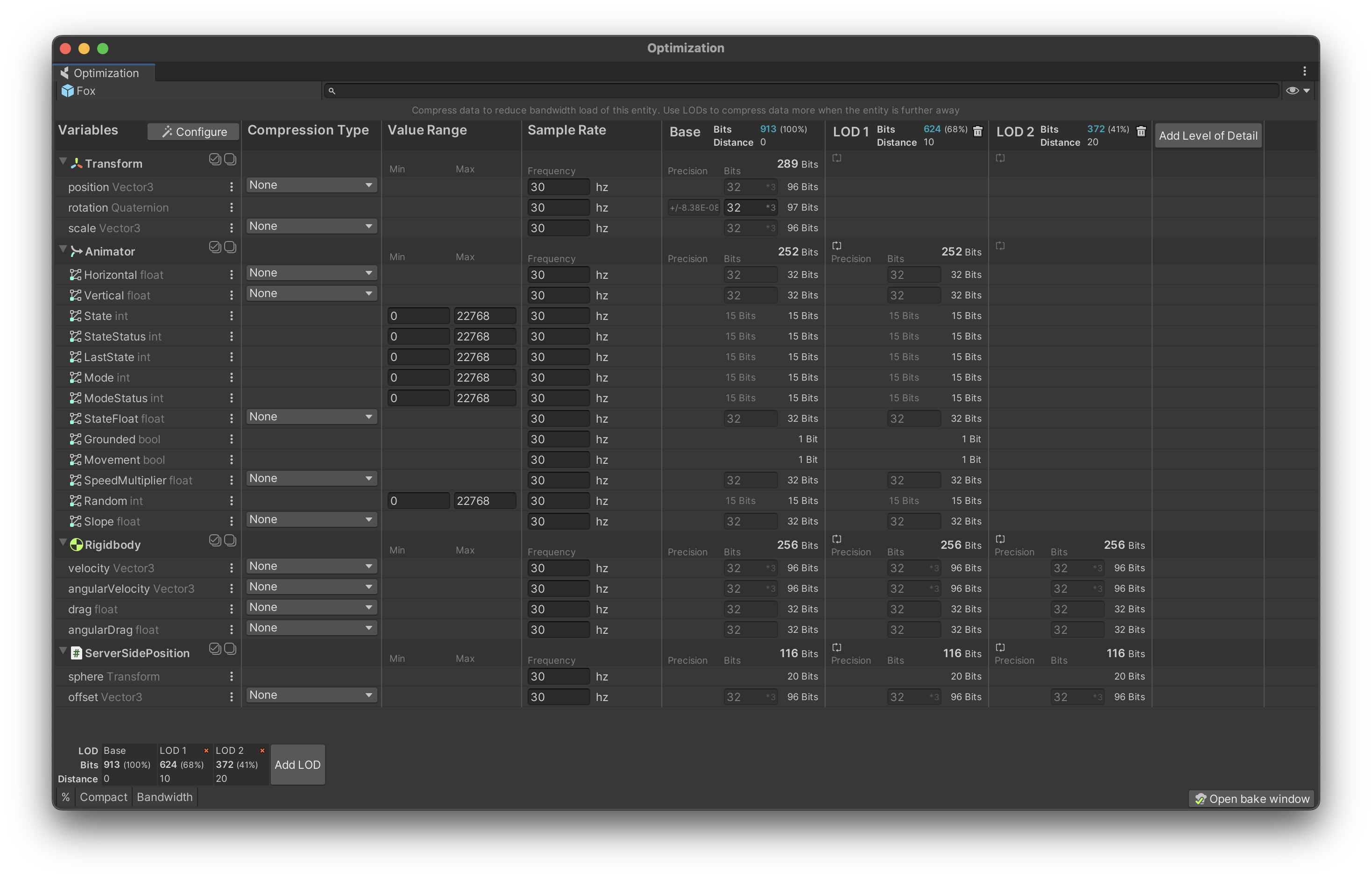 In order to define levels of detail, we have to click the Optimize button on a Prefab's CoherenceSync component with defined field bindings.