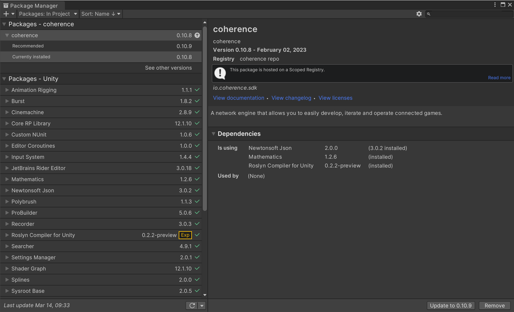 <figure><img src="https://content.gitbook.com/content/naCaDgmbFRSw0e7nxNNK/blobs/1lkFOTlmtTmCGN9vdLlU/01%20Package%20Manager.png" alt=""><figcaption><p>Unity Package Manager showing coherence installation</p></figcaption></figure>
