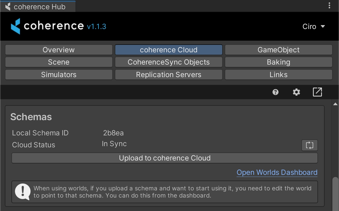 In the coherence Hub window, select the coherence Cloud tab, and click on Upload to coherence Cloud in the Schemas section.