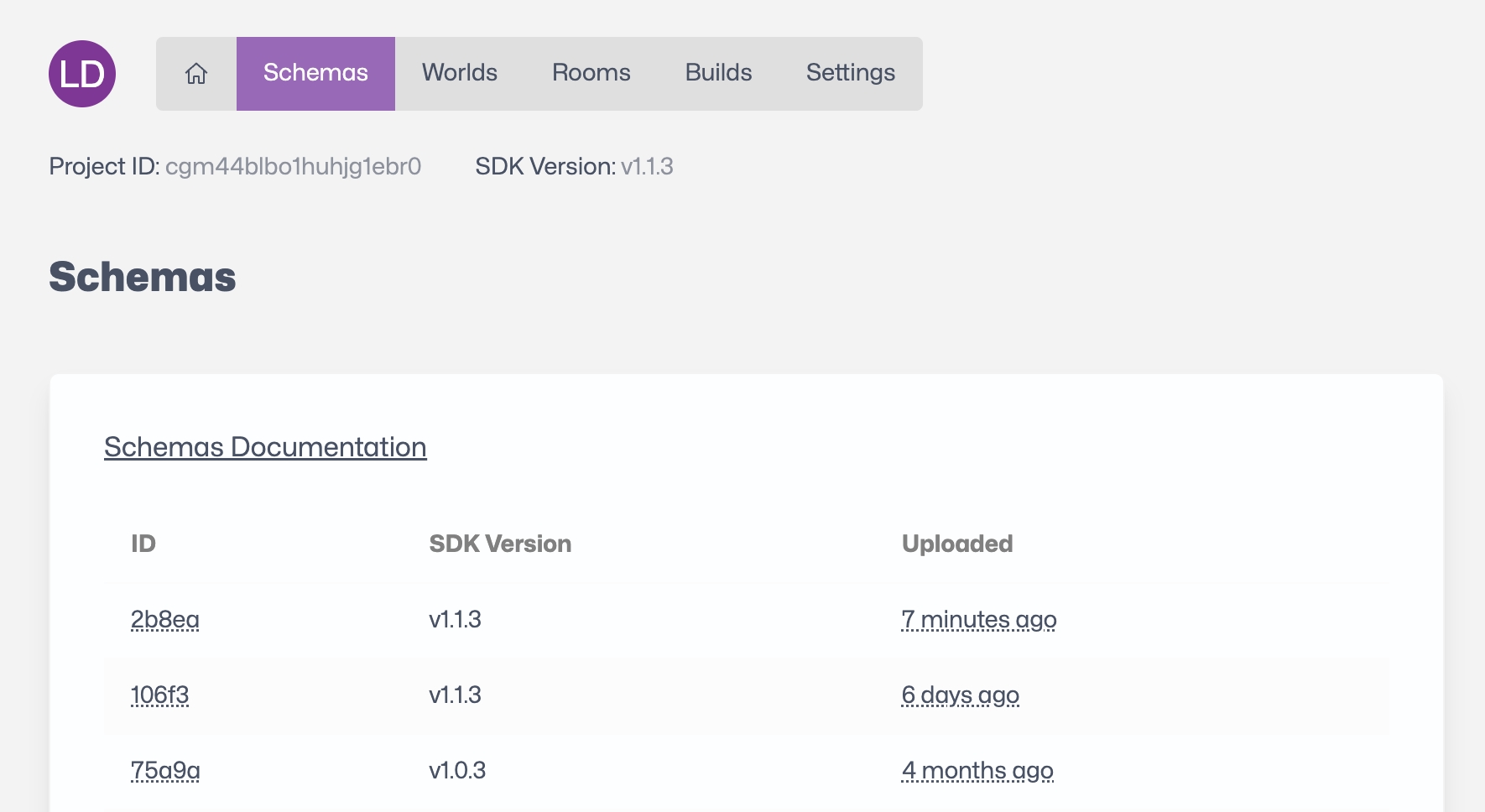 The uploaded schemas, visible in the cloud Dashboard
