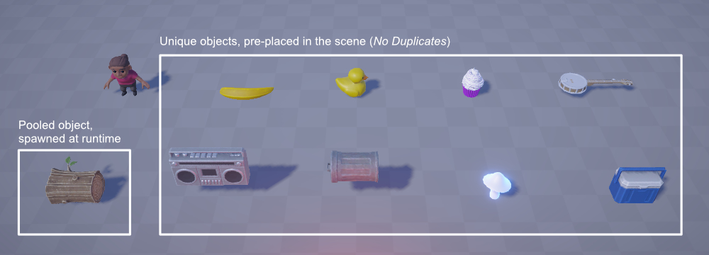 Instead, the other burnable objects are pre-placed in the scene, and set to be unique (*No Duplicates*): the banjo, the cooler, the bins, the mushrooms, and more. More details on the lifetime of these pre-placed objects in [the section below](#the-server-side-keeper-robot).