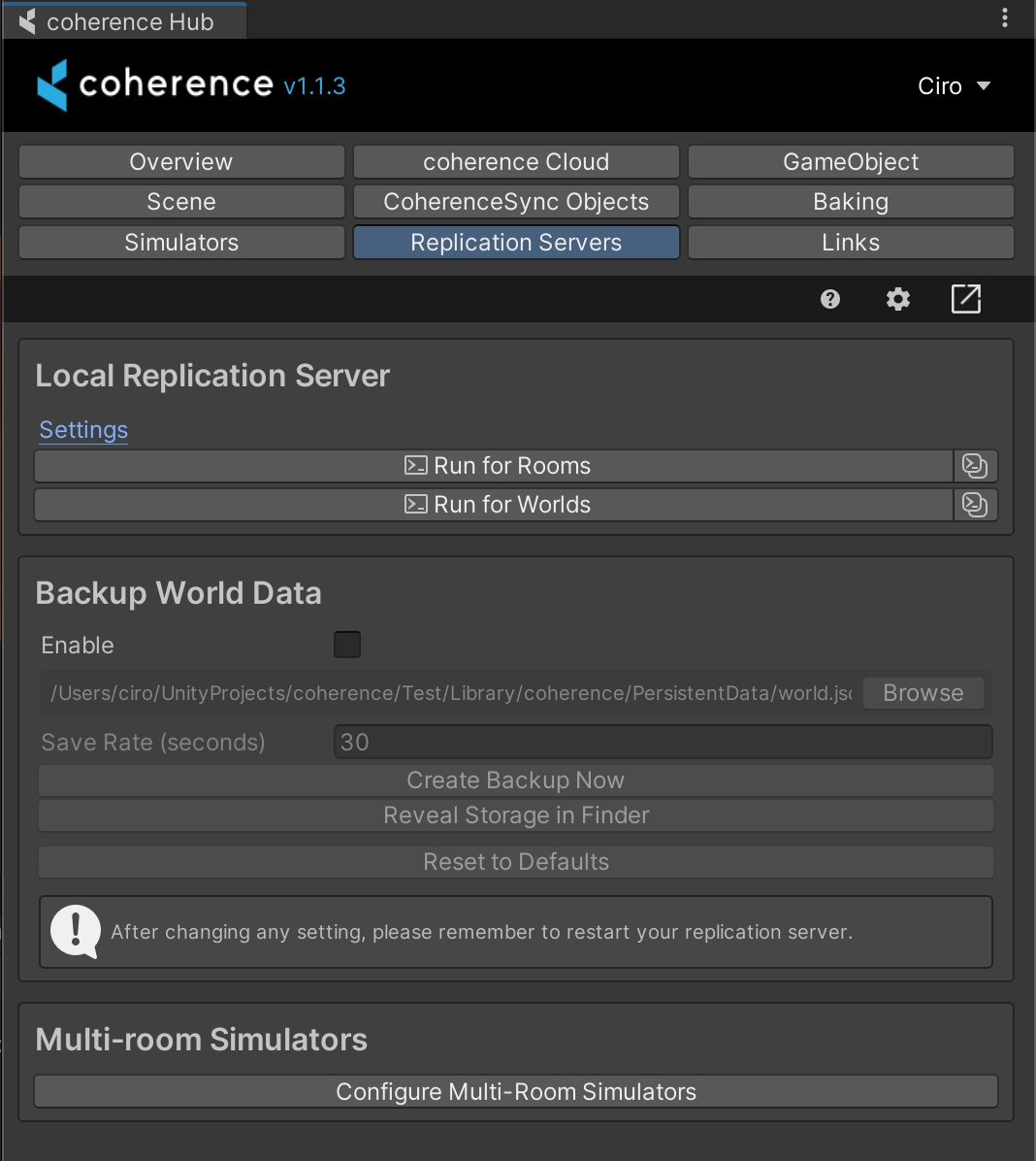 coherence > Local Replication Server > Run for Rooms / Run for Worlds