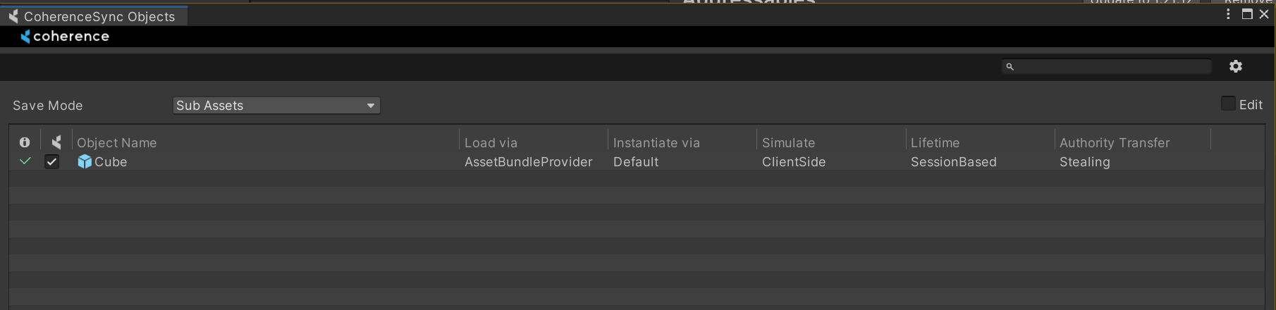 You can inspect all of the CoherenceSyncConfig assets in one place in the CoherenceSync Objects window, found under the coherence > CoherenceSync Objects menu item: