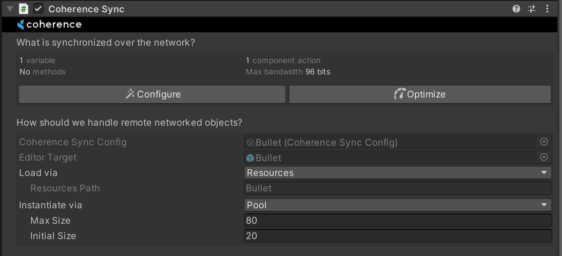 Whenever you start synchronizing one of your Prefabs, either by adding the CoherenceSync component manually or clicking the Sync with coherence toggle in the Prefab inspector, coherence will create a CoherenceSyncConfig ScriptableObject to track the existence of this entity, and add it to a registry.