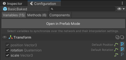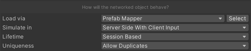 If you want to use a Server-authoritative setup without sacrificing input responsiveness, you need to use Client-side prediction. With Client-side prediction enabled, incoming network data is ignored for one or more bindings, allowing the Client to predict those values locally. Usually, position and rotation are predicted for the local player, but you can toggle Client-side prediction for any binding in the Configuration window.