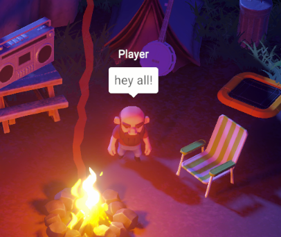 We wanted to implement a very simple chat system. By pressing Enter, a small screen-space UI opens up and allows the player to compose a message. When they press Enter again, a balloon on top of their character displays the message to them, and to all connected Clients.
