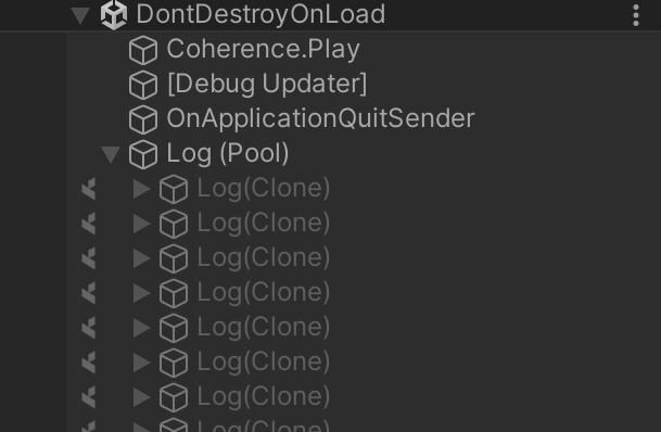 When we press Play, coherence instantiates these 10 logs, deactivate them, and put the pool in the DontDestroyOnLoad scene: