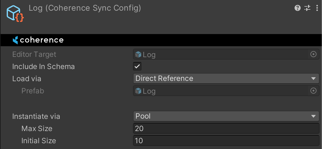 This CoherenceSyncConfig contains all the info that coherence needs to handle this particular Prefab over the network. If we inspect it, we will notice that it contains in fact how the object is loaded (Load via) and how it's instantiated (Instantiate via).