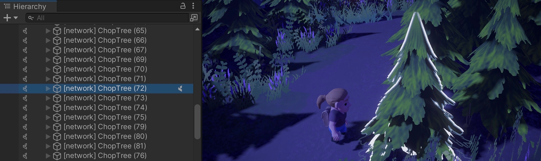 (3) If so, CutDown() is invoked locally, spawning the log and informing all other clients to play the animation of the tree disappearing: