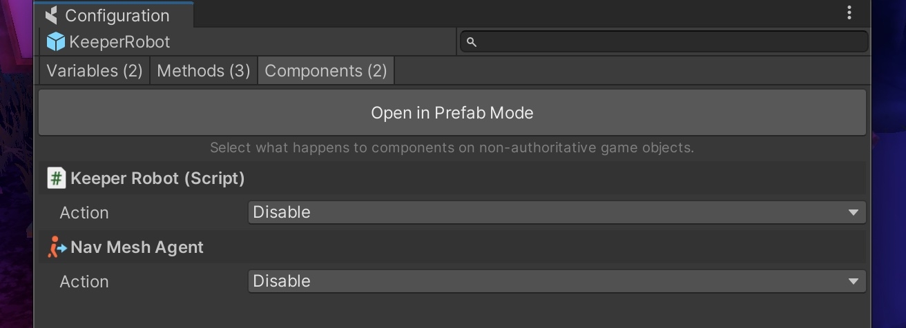 We also set both the KeeperRobot script and the NavMeshAgent to disable on remote instances from the coherence Configuration panel, so they automatically turns themselves off on Client machines.