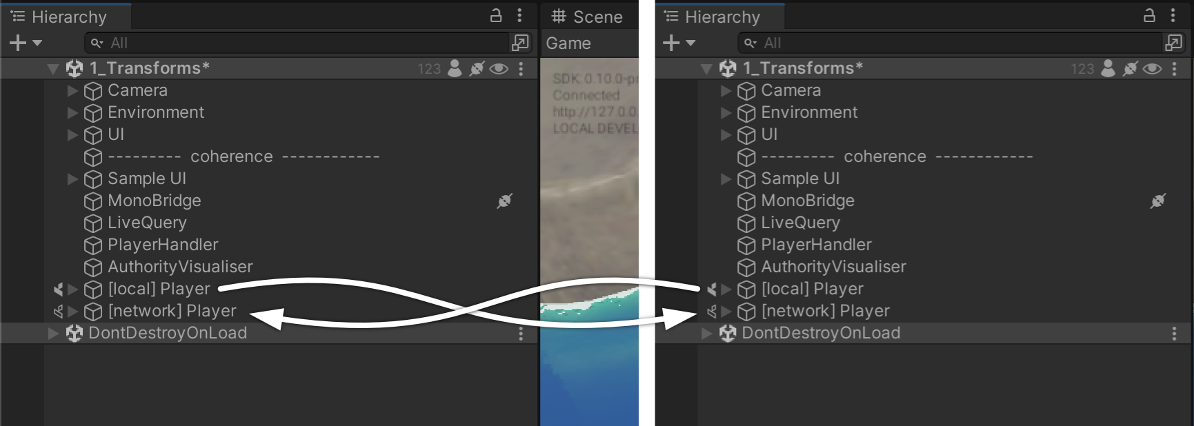 coherence takes care of keeping network entities in sync on all Clients. When another Client connects, an instance of your character is instantiated in their scene, and an instance of their character is instantiated into yours. We refer to this as network instantiation.