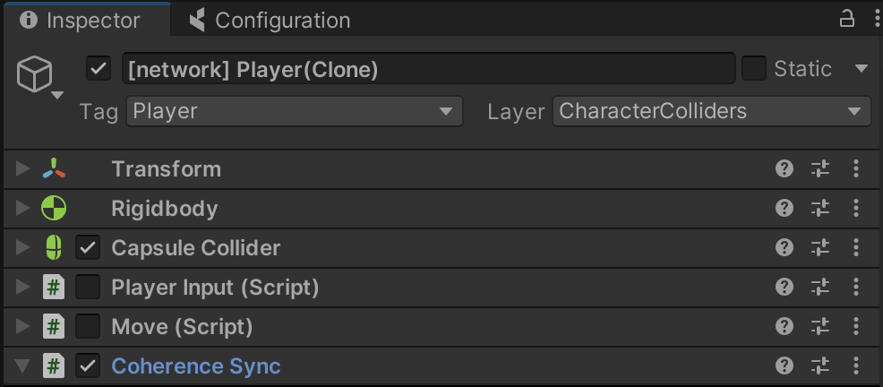 While in Play Mode, try selecting a remote player character. You will notice that some of its script have been disabled by coherence: