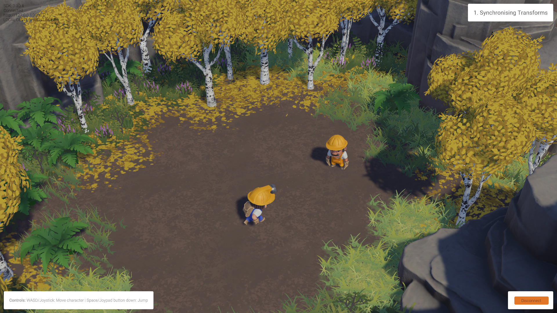 Upon connecting, a script instantiates a character for you. Now you can move and jump around, and you will see other characters move too.