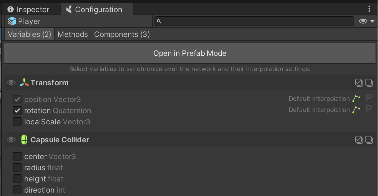 By opening coherence's Configuration window (either by clicking on the Configure button on the CoherenceSync component, or by going to coherence > GameObject Setup > Configure), you can see what is synced over the network.