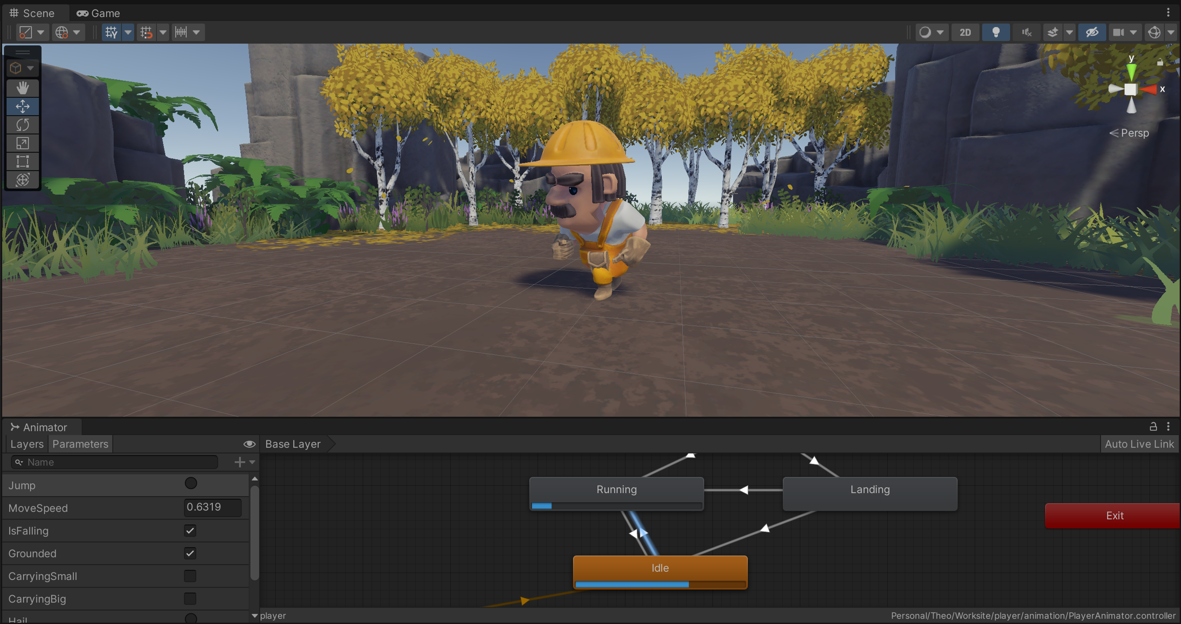 Open the player Prefab located in the /Prefabs/Characters folder. Browse its Hierarchy until you find the child GameObject called Workman. You will notice it has an Animator component.