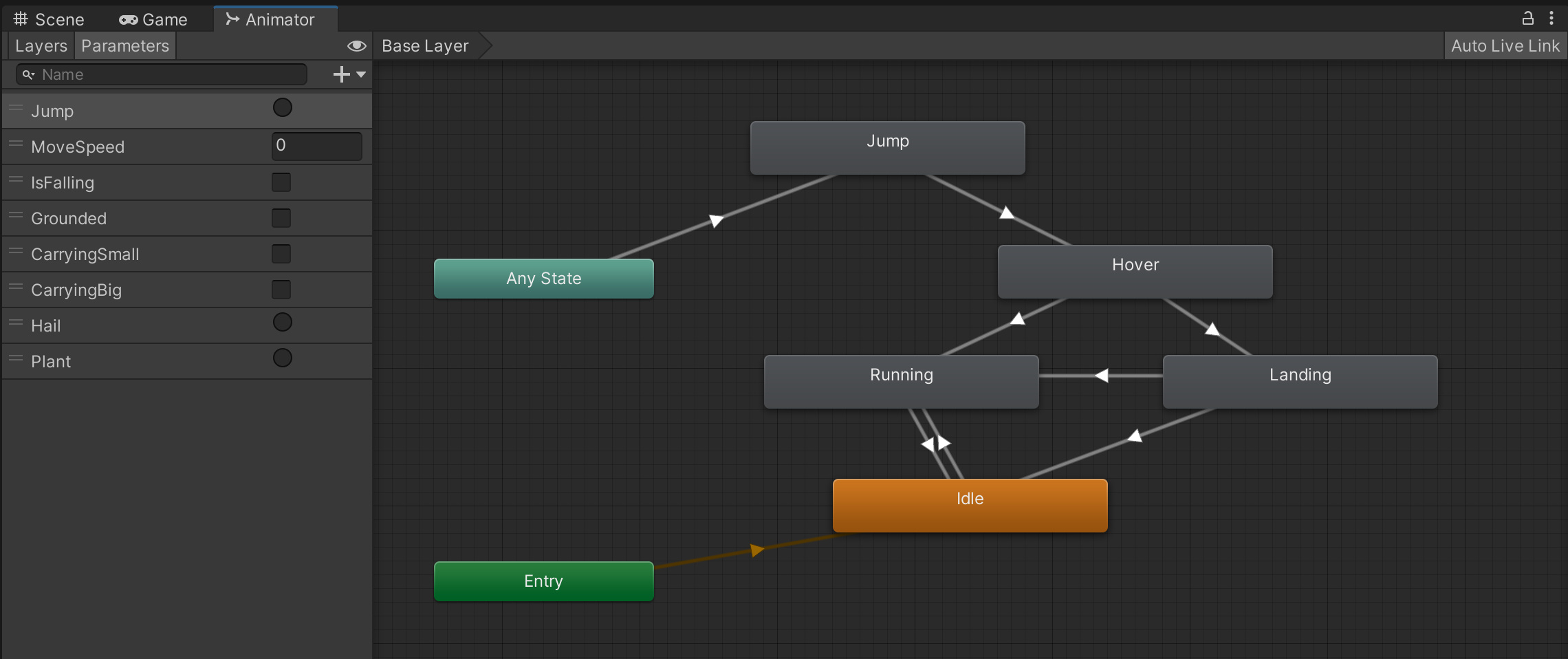As is usually the case, animation is controlled by a few Animator parameters of different types (int, bool, float, etc.).