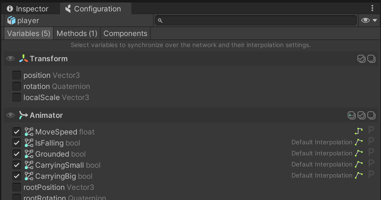 Since Triggers are not a variable holding a value that changes over time, but rather an action that happens instantaneously, we can't just enable in the Config window like with other animator parameters. We will see how to sync them in the next lesson, using Network Commands.