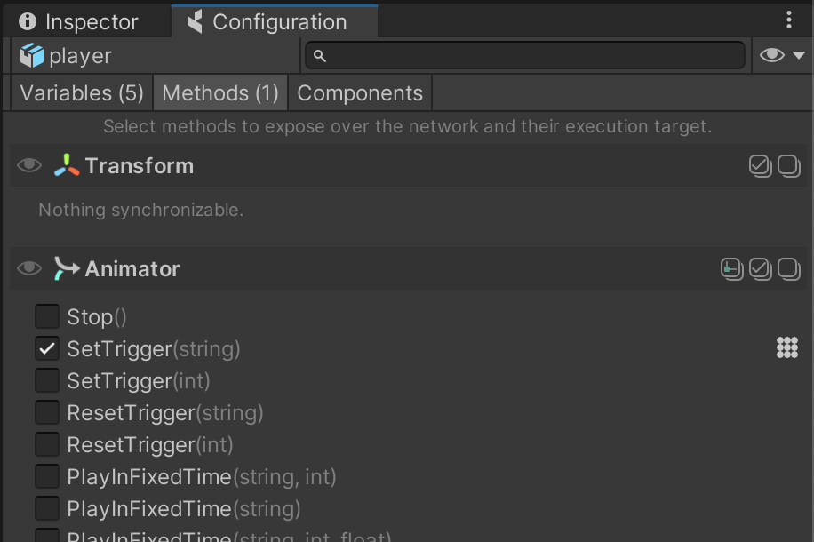 You can see how the method Animator.SetTrigger(string) has been marked as a Network Command. With this done, it is now possible to invoke it over the network using code.