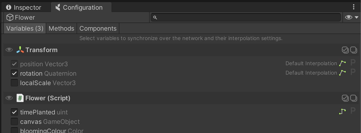 Opening coherence's Configuration window, you will see that we sync position, rotation, and a variable called timePlanted