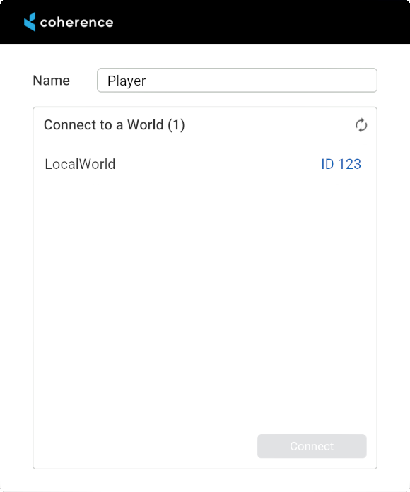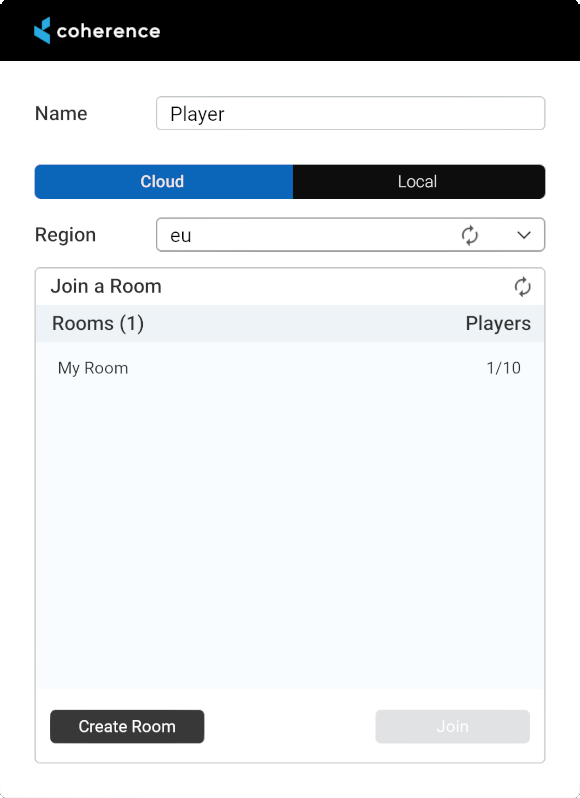 Next is a dropdown for region selection. This dropdown is populated when regions are fetched from the coherence cloud. The default selection is the first available region. This is not enabled when you switch from Cloud to Local. This is also only relevant if you deploy your game to several different regions.