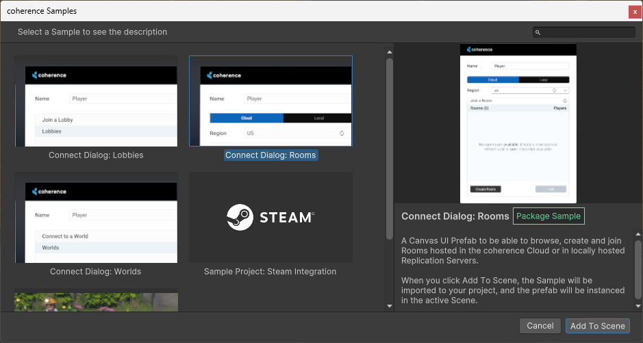 Each sample comes with a Prefab that can be added to your Scene. You can add them via coherence > Explore Samples.
