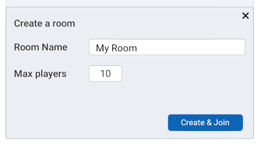 This section contains controls for setting a Room's name and maximum player capacity. Pressing the Create button will create a Room with the specified parameters and immediately add it to the Room Dropdown above. Create and Join will create the Room, and also join it immediately.
