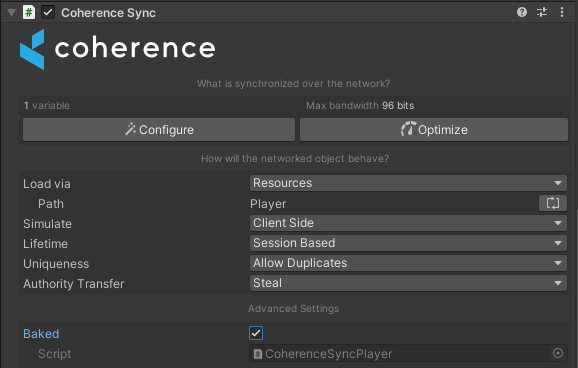 Create a GameObject and attach the Player script to it, using the CoherenceSync inspector create a Prefab.