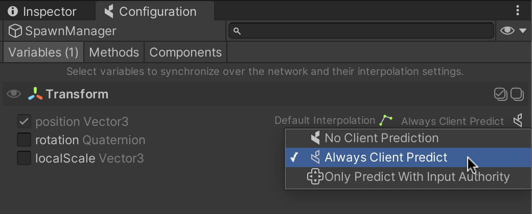 In a deterministic simulation, it is our code that is responsible for producing deterministic output on all Clients. This means that automatic syncing is no longer desirable. To turn auto-syncing off, click on the button with the coherence symbol next to bindings in the Configuration window and select Always Client Predict. This will stop the automatic syncing, and allow us to predict this binding and write to it.