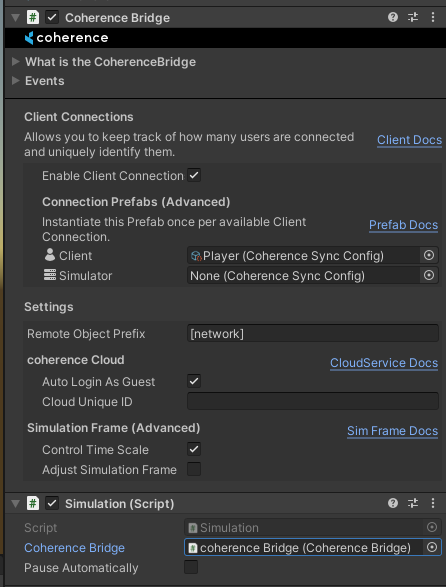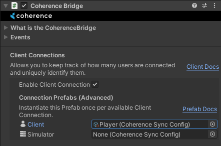 Since our player is intended to be a Client Connection Prefab, we must set it as such in the CoherenceBridge and Enable Client Connections:
