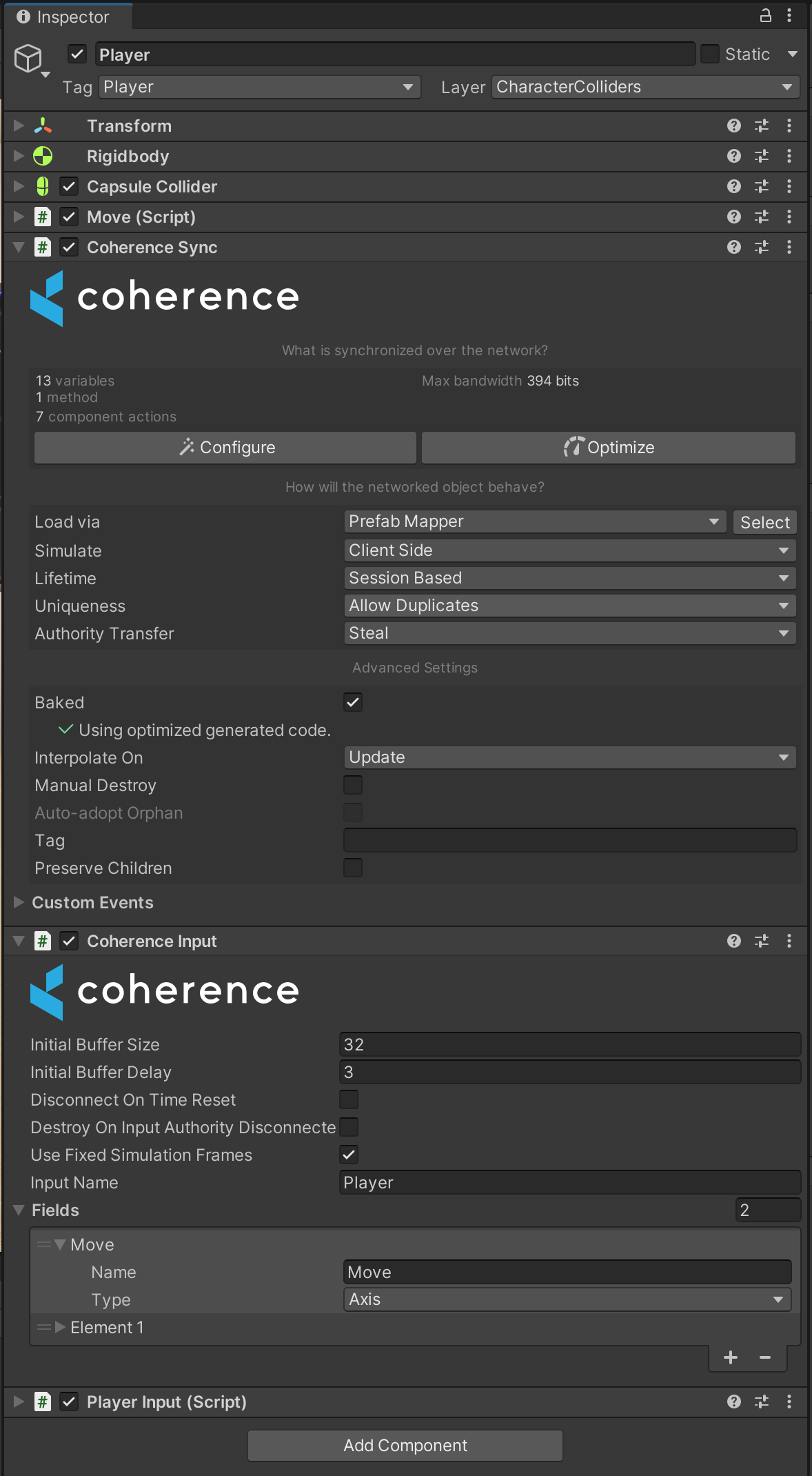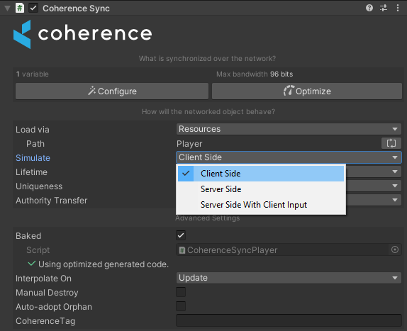 Move2D axis has been added to the CoherenceInput which will let us sync the movement input state.Unlike in the Server authoritative setup our simulation uses client-to-client communication, meaning each Client is responsible for its Entity and sending inputs to other Clients. To ensure this behavior set the Simulate property to Client Side.