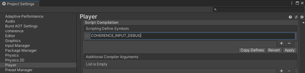 Since debugging might induce a non-negligible overhead it is turned off by default. To turn it on, add a COHERENCE_INPUT_DEBUG scripting define: