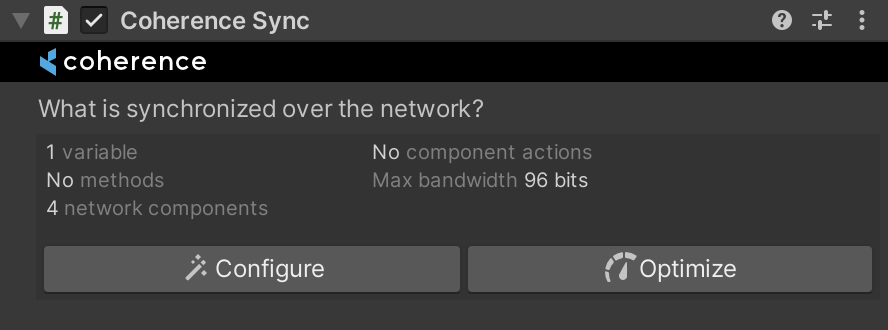 To start syncing variables, open the Configure window that you can access from the CoherenceSync's Inspector.