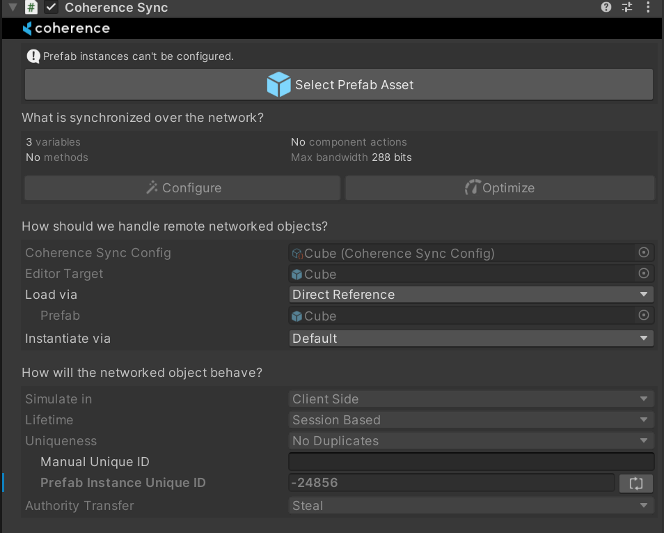 Once a CoherenceSync is added to a Prefab, you can select which individual public properties you would like to sync across the network, expose methods as Network Commands, and configure other network-related properties.