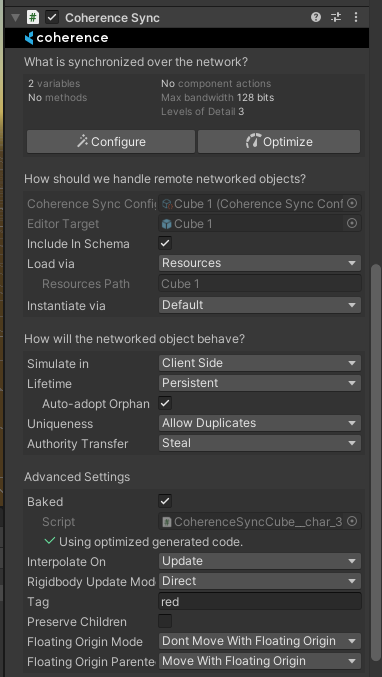 All networked GameObjects with matching tags will now be visible to the Client. The coherence tag can be any string and can be configured in the Advanced Settings section of the CoherenceSync component.