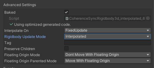 The CoherenceSync component supports three modes for replication of Unity rigid bodies: