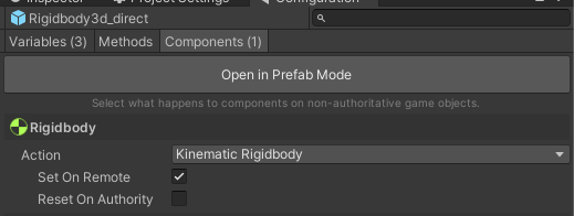 Supporting Unity physics in a network environment requires managing the state of rigid bodies on replicated Prefabs. Generally, if a Prefab using CoherenceSync has a Rigidbody or Rigidbody2D component, the replicated instances of the Prefab should have the body set to kinematic so that they do not simulate in the physics step on non-authoritative clients. There is a convenient configuration for this in the CoherenceSync configuration components tab.