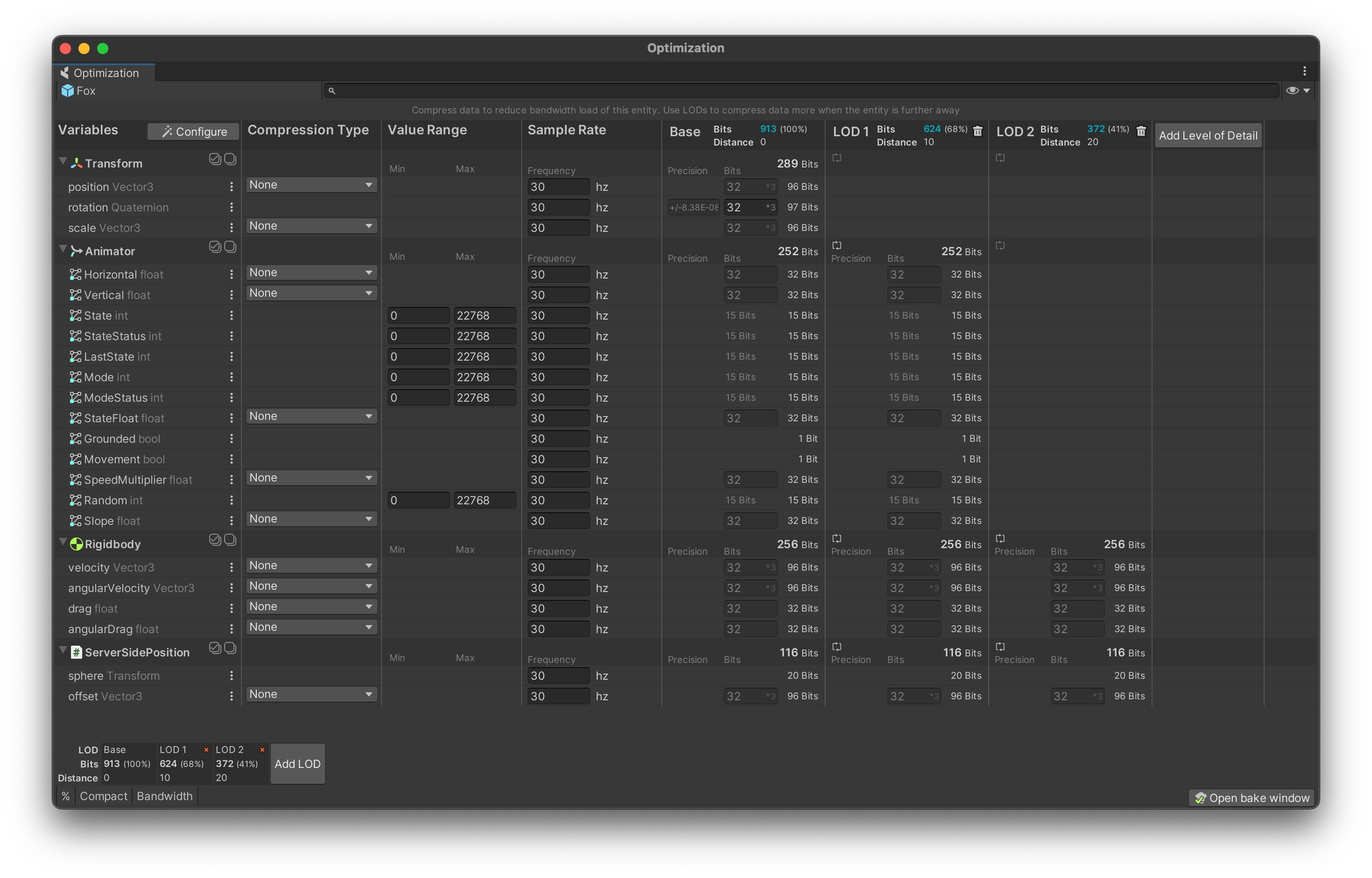 The Data Cost Overview shows us that this takes the original 913 bits down to just 372 bits at LOD level 2.