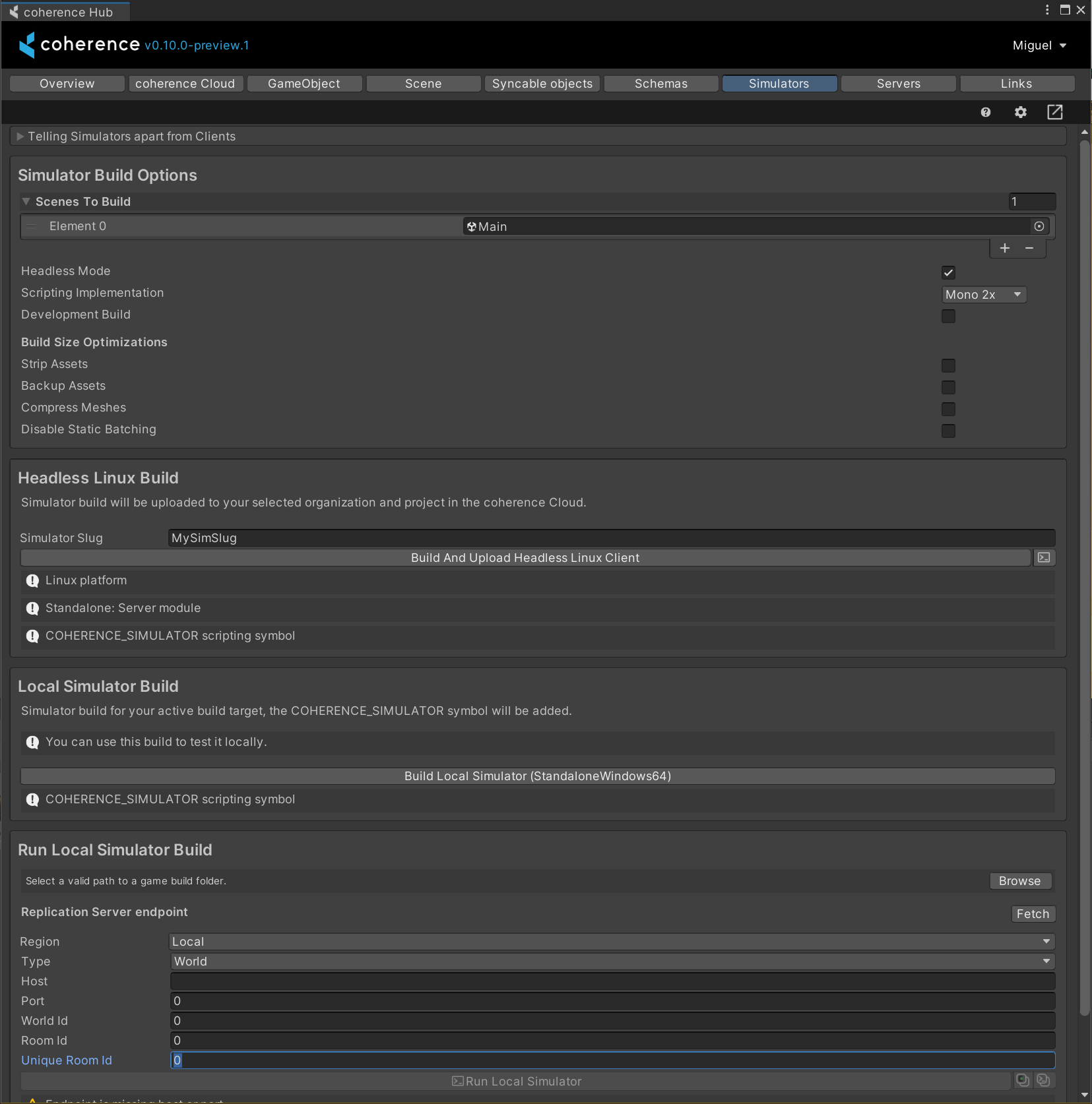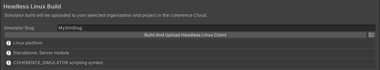 A Simulator build is a built Unity Player for the Linux 64-bit platform that you can upload to coherence straight from the Unity Editor.