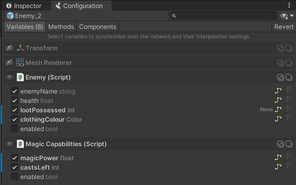 's Inspector. This brings up the Configuration window. Here you can select which variables you would like to sync across the network:
