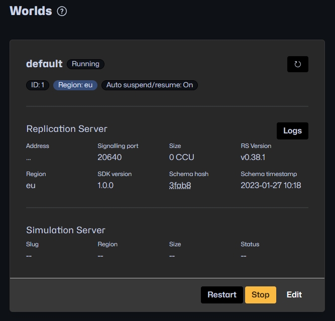 The state of the World is automatically managed by default. Inactive Worlds with no connected players are suspended and then resumed when there are players online. Suspended Worlds retain their state and it only takes seconds to bring them back up and running.