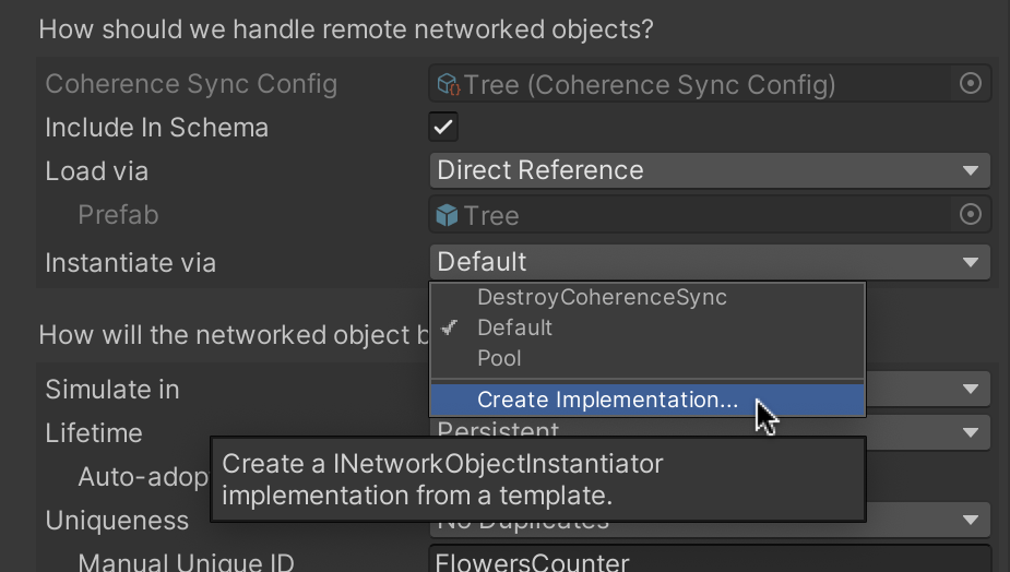 Once created, implementations of this interface will appear in the **Instantiate via** dropdown shown above, or in the corresponding CoherenceSyncObject asset.
