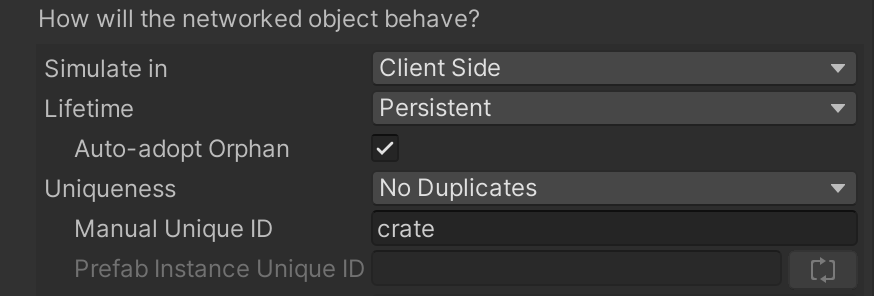 In addition to a unique identifier (the **Manual Unique ID**), **coherence** will auto-assign an additional identifier (the **Prefab Instance Unique ID**) whenever the crate is instantiated in the scene at edit time.