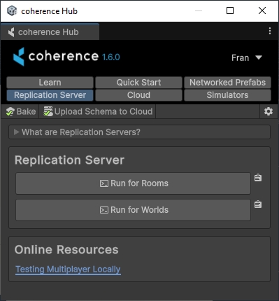 In the Hub, open the Replication Server tab. From here, you can run a server for Rooms or Worlds:
