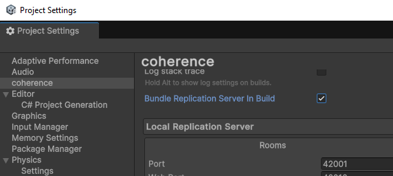 To bundle the coherence Replication Server with the build of your game, go to coherence > Settings > Bundle stand-alone Replication Server and check what platforms should have this feature enabled.