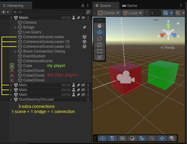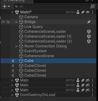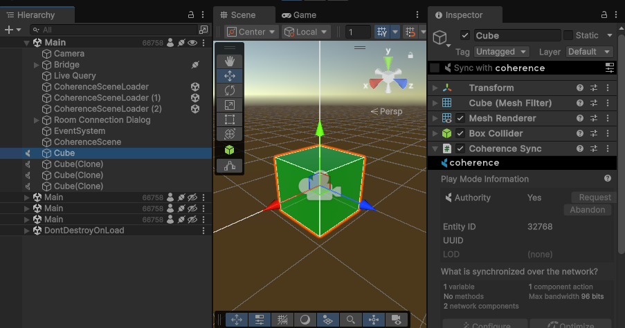 Once connected to the room (i.e., the CoherenceBridge establishes connection), the 3 CoherenceSceneLoaders will trigger — as they are attached to the scene's CoherenceBridge — and load 3 additional scenes, that will automatically connect to the network as well.